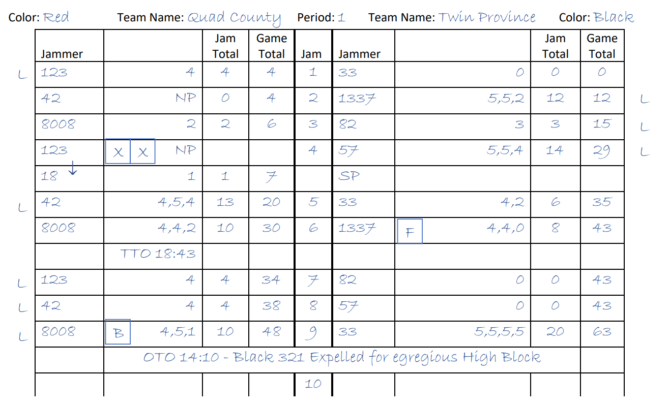 When a jammer gets a penalty, I write the penalty code near the left side of the notes box and put a square or “box” around it. This makes counting jammer penalties quick and easy and also helps keep track of trends in kinds of penalties a particular team’s jammers are getting. Again, these are things that can be turning points in a game or can help announcers tell a story of a particular jammer if penalties are the thing.