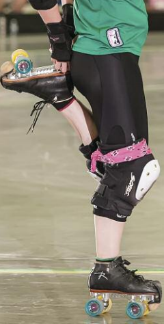 Any athlete hates to hear this advice, but to heal ongoing problems with shin splints, it is often necessary to rest and even take some time off from your sport. Relative or “active rest,” switching to an activity like cycling or swimming that does not cause the shins to hurt, maybe a good way to go. Ice and anti-inflammatories can help, as well. Some skaters use foam or plastic rollers (like “The Stick”) to stretch the affected muscles. An orthotic in your skates can help the problem if you are an overpronator. There are also neoprene compression sleeves that are sold to wear on the lower leg, which some athletes have found useful. Tape or an Ace bandage may also wrap the lower leg. Physical therapy and stretches can help. Stretch the Achilles and calves regularly. Some have advocated walking on your heels for 30 seconds, alternating with walking flat-footed for 30 seconds, repeated for four or five minutes, several times a day, as a treatment and prevention strategy. Another stretch involves kneeling with the toes pointed straight back, then sitting back onto the calves and heels until tension is felt in the shins. It may be difficult to spend a lot of time in derby skating in the opposite direction, but trying to do so for cool-down at the end of a workout might help to even things up a bit.